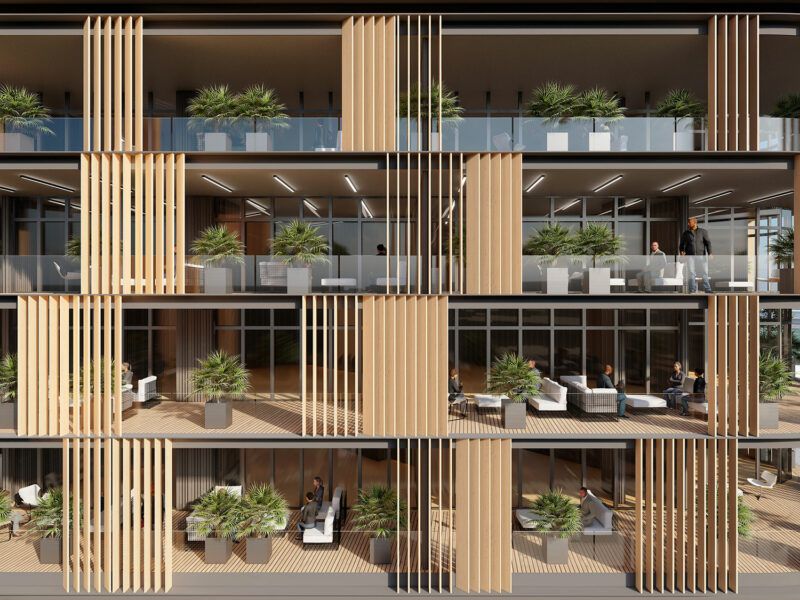 La double façade des bâtiments permettra donc de protéger les espaces intérieurs des rayons du soleil de façon naturelle et modulable, facilitant ainsi l’évacuation naturelle de l’air chaud et la libre circulation des vents dominants le long des balcons.