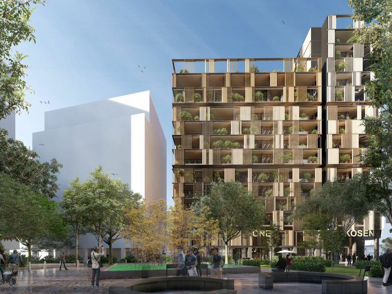 La nature fait partie intégrante de Kōsen avec de grands arbres plantés en pleine terre, des jardins en rez-de-chaussée et sur les toits, ainsi qu’une stratégie de végétalisation verticale sur les balcons des terrasses.